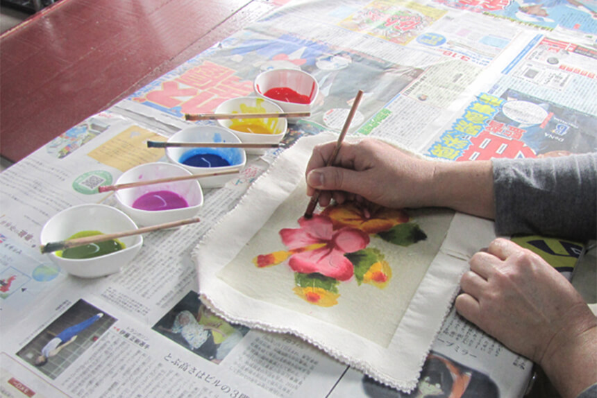 古来より“子孫繁栄”、“長寿”“家庭円満”という願いが込められているサンゴ。那覇市首里の住宅街に佇む「首里琉染」では、ここでしか体験できないサンゴ染めの染色体験ができる。サンゴの化石を使用して、風呂敷やタンブラー、Tシャツ、トートバックなどの中から好みのアイテムを選び、染め道具に色とりどりの染料を含ませて染めていく。 500年の伝統を誇る沖縄の染物「紅型」は艶やかな色彩が魅力!自分の手で思い思いの色に染め上げて。