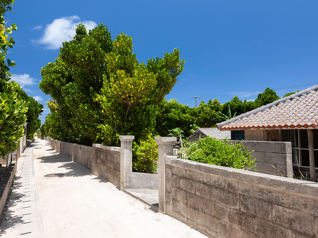 青々と生い茂るフクギ、白砂の道、赤瓦屋根の伝統的な家。100年以上前から、フクギは風対策として渡名喜島の家々を守ってきました。昔ながらの生活の営みを感じることができる、情緒溢れる景観がそこには広がっています。