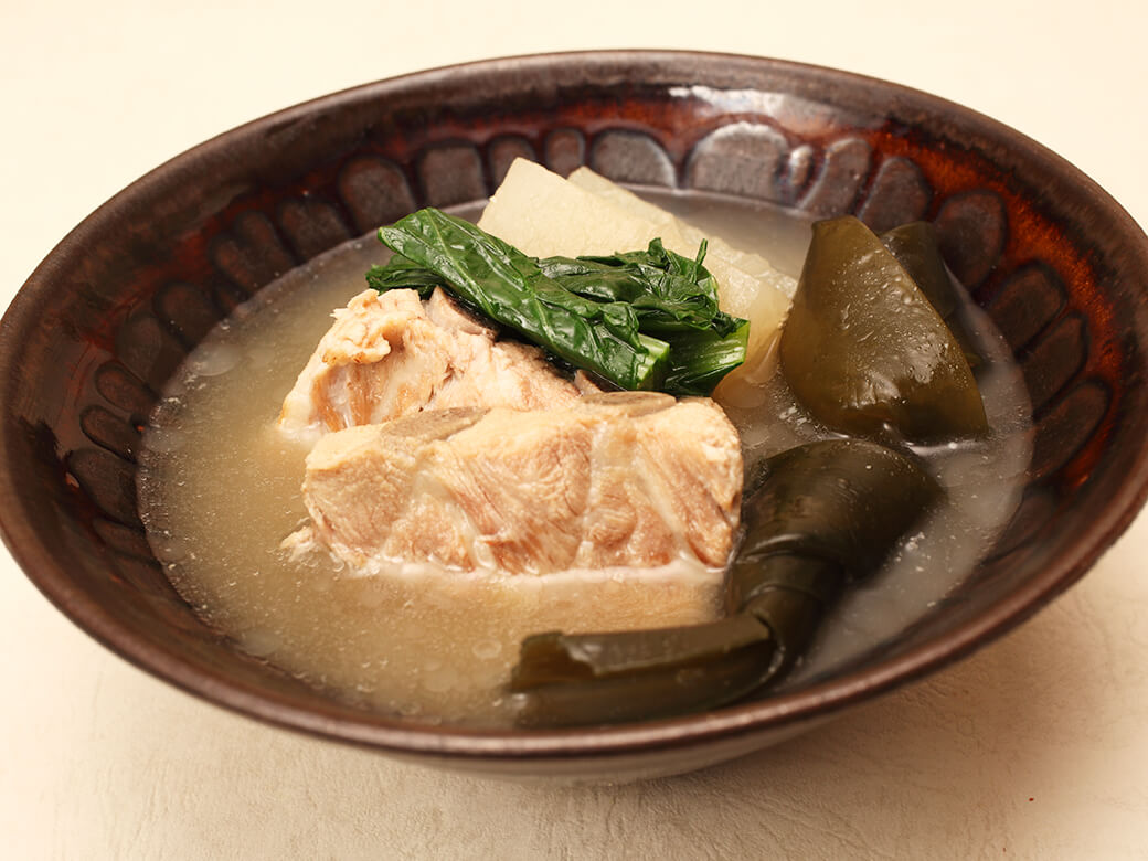 ©OCVB沖縄にはお肉が入った汁物メニューもたくさんあります。代表的なものと言えば「中身汁」(豚の小腸・大腸などのモツを干しシイタケとかつおだしで丁寧に煮た吸い物)、「いなむどぅち」(豚肉・こんにゃく・かまぼこ・干しシイタケが入った白みそ仕立ての汁物)、「ソーキ汁」(スペアリブと昆布、大根や冬瓜を煮た汁物)など。いずれも祝い事の席でふるまわれることが多いおもてなし料理で、沖縄のお正月はお雑煮ではなくこれらの汁物が提供されることも多いです。ご飯が付けば立派な定食として成り立つほど具沢山な汁物メニュー、見つけたらぜひ味わってみて下さいね。
