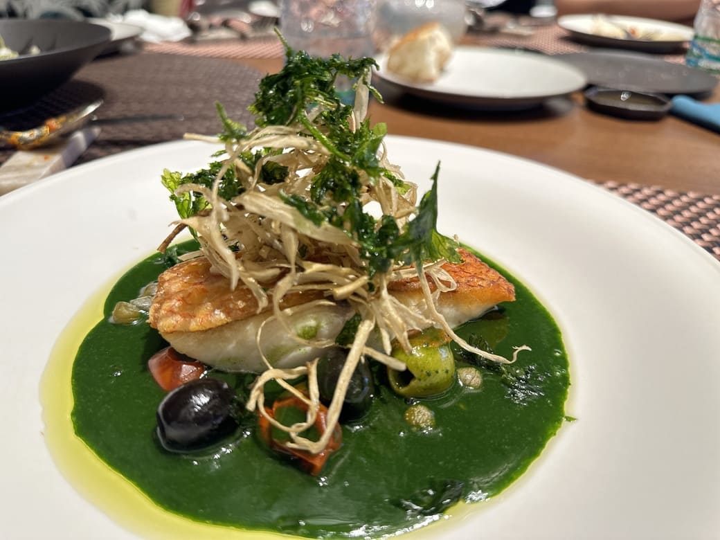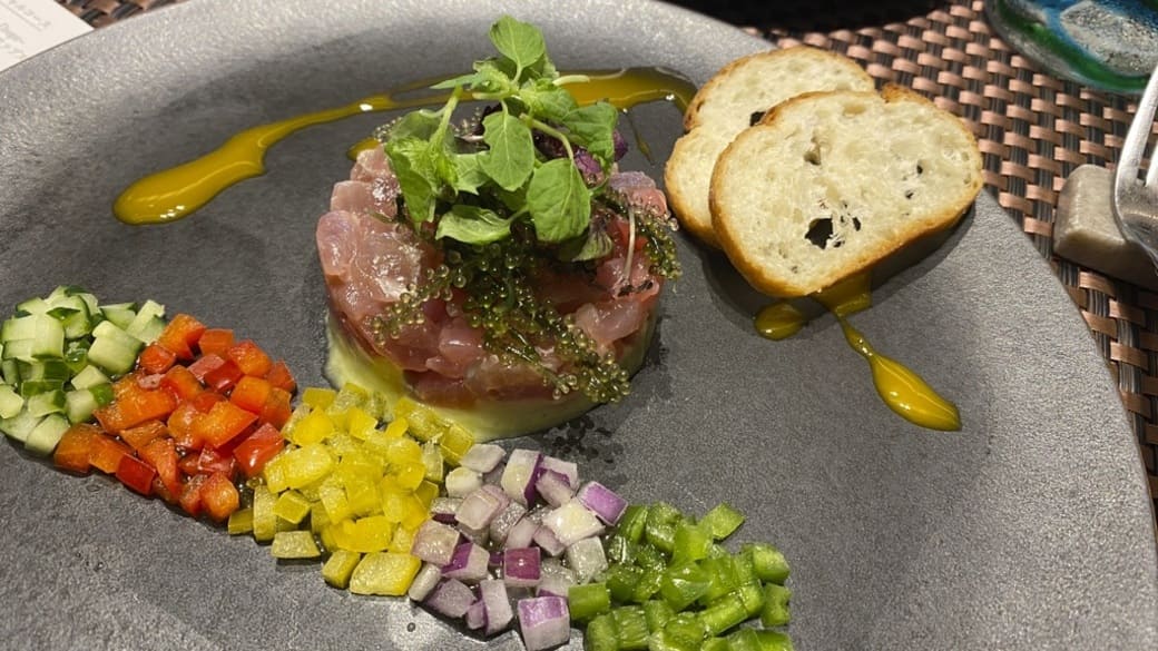 「セレクトコースYAMBARU」では、マグロのカルパッチョや、沖縄県産ハーブ鶏骨付きもも肉のグリルやアクアパッチャなど、やんばるの食材をふんだんに使用した料理が並びます