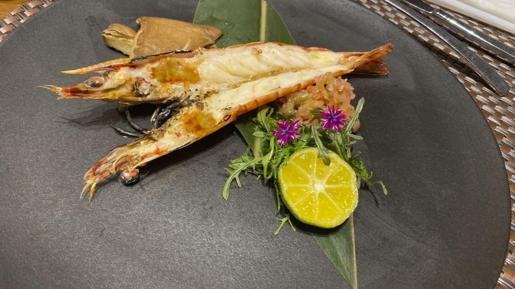 「JUNGLIAスペシャルコース」は全9品のコース料理。チラガー(豚の顔の皮)、車エビ、シークワサーなど、沖縄ならではの山海の幸を存分に味わえます。