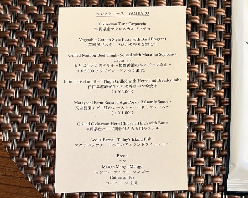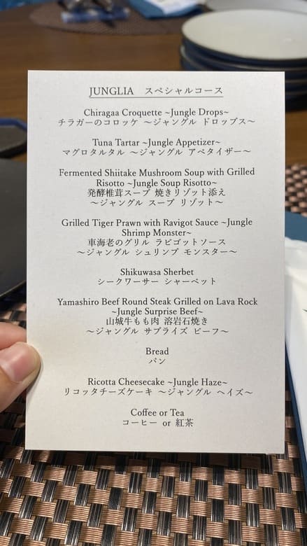 ディナーは予約必須なので、事前に計画しておくのが安心!今回いただいたのは「JUNGLIAスペシャルコース」と「セレクトコース YAMBARU」。